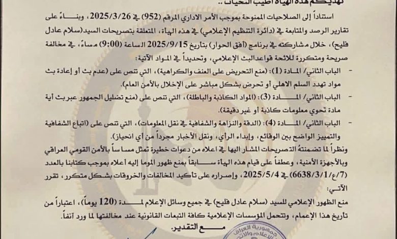 إلوسق الاخبارية .. قررت هيئة الإعلام والاتصالات منع ظهور الإعلامي سلام عادل خليج في جميع وسائل الإعلام لمدة 120 يومًا اعتبارًا من 24 أيلول 2025.