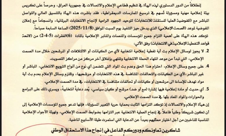 وأضاف، أن “احترام الصمت الانتخابي يمثل دعماً مباشراً للمسار الديمقراطي ولحق المواطن في اتخاذ قراره بحرية تامة بعيداً عن أي مؤثرات إعلامية، مشيراً إلى أن الهيئة حريصة على متابعة السياقات القانونية من أجل تحقيق مناخ صحي لهذه الممارسة الديمقراطية المهمة”.