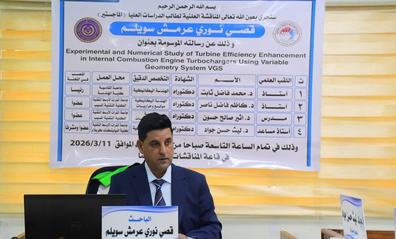 رسالة ماجستير في الكلية التقنية المسيب تتوصل إلى تحسين كفاءة التوربين الشاحن التوربيني بنسبة 142%