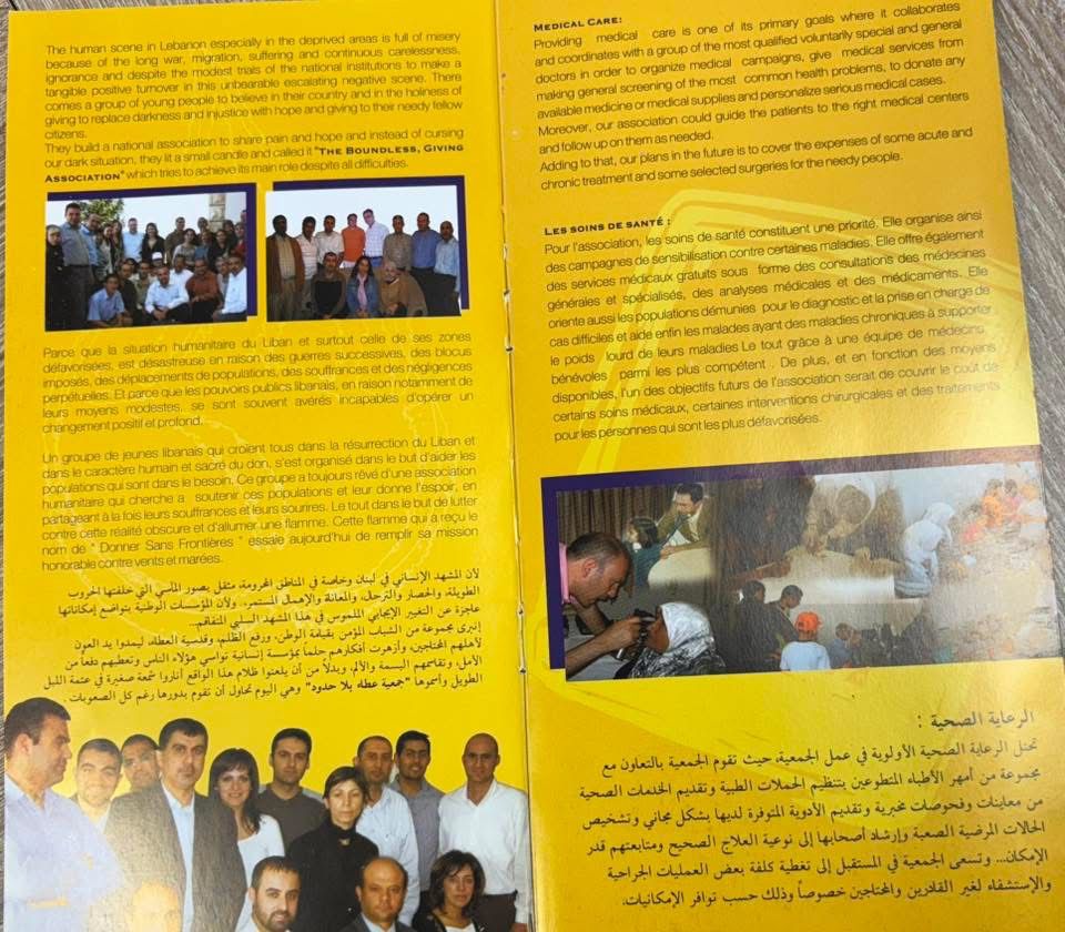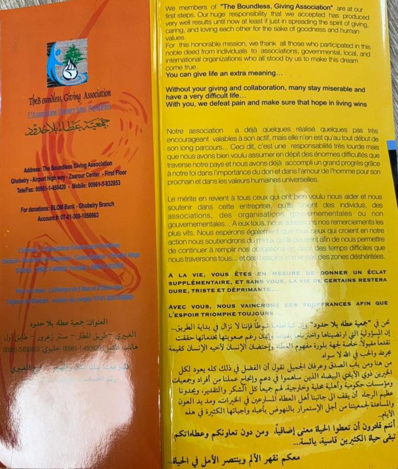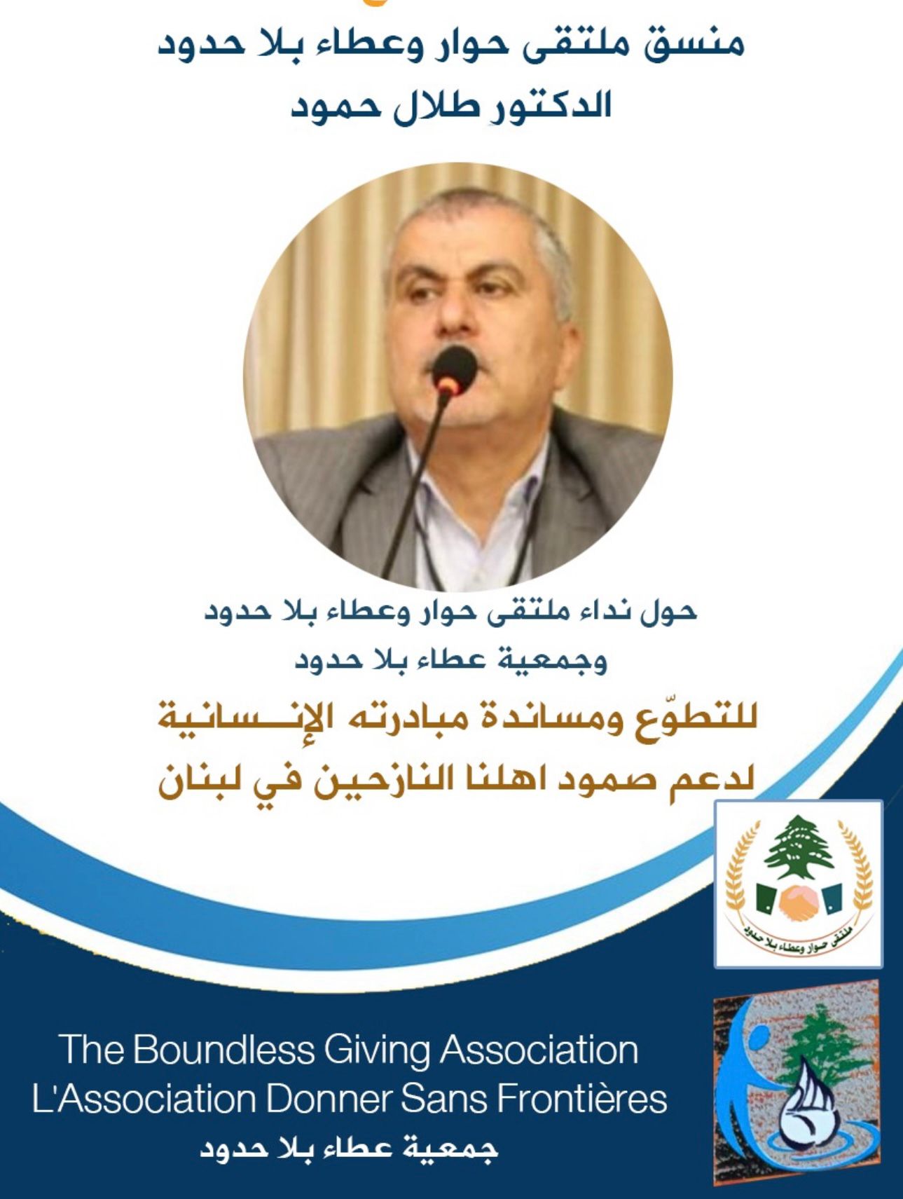 لذلك، أخاطبكم باسمي وباسم الهيئتين الإداريتين لملتقى حوار وعطاء بلا حدود وجمعية عطاء بلا حدود، متوجّهًا إلى جميع أصحاب الأيادي البيضاء، والمقتدرين، والمغتربين، وأصحاب القلوب الرحيمة والثروات، مهما كان حجمها: