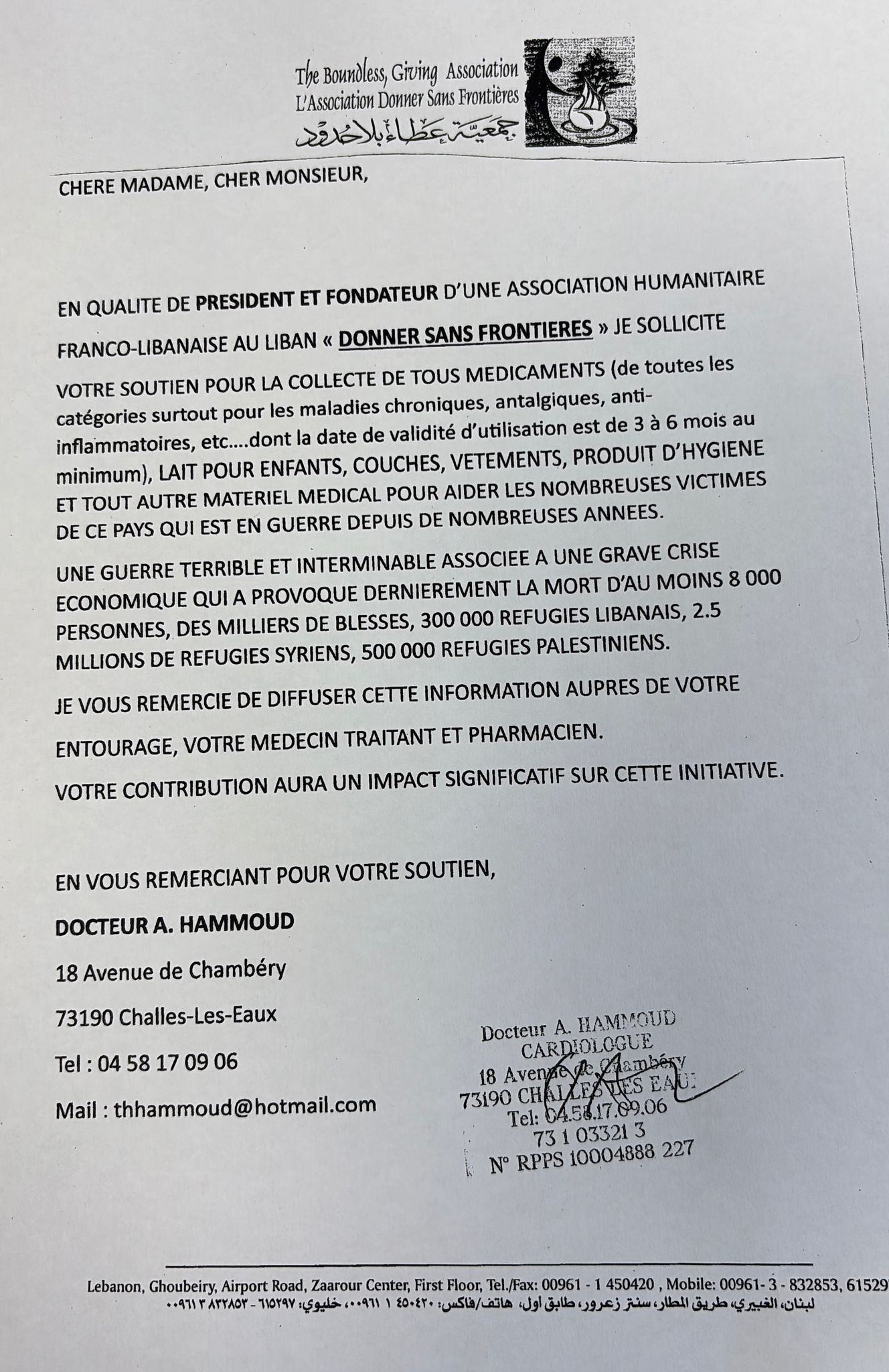 وفي هذا الإطار، أطلقنا منذ نحو شهرين مبادرةً لجمع التبرعات والأدوية والمستلزمات الطبية والصحية في مدينة Chambéry جنوب فرنسا، وقد لاقت تجاوبًا واسعًا ومؤثّرًا من المواطنين الفرنسيين والعرب، ونحن بصدد توسيعها لتشمل معظم المدن الفرنسية والأوروبية وبلاد الاغتراب، إن شاء الله.