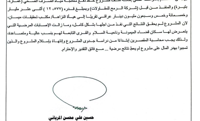 عضو بمجلس ميسان يخاطب رئاسة المجلس بإحالة احد مشاريع معالجة مياه الصرف الصحي الى النزاهة