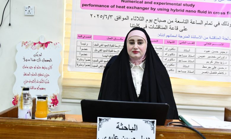 ناقشت الكلية التقنية المسيب إحدى تشكيلات جامعة الفرات الاوسط التقنية، رسالة ماجستير في تخصص تقنيات هندسة ميكانيك القدرة للباحثة هديل حسين عليوي ،تناولت دراسة متقدمة حول “تحسين أداء المبادلات الحرارية في أنظمة تبريد السيارات باستخدام السوائل النانوية الهجينة، حيث جمعت بين التحليل العددي والاختبارات التجريبية لتحقيق نتائج مبتكرة.